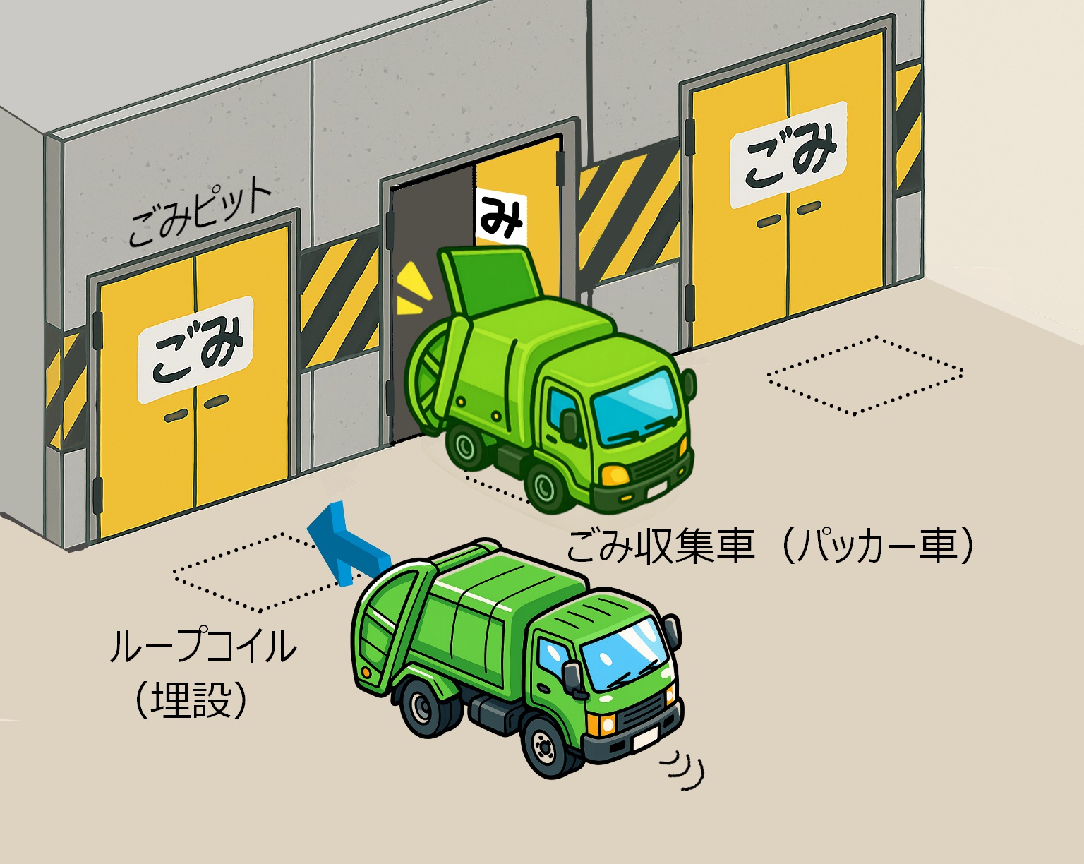 多くのごみ処理施設では、搬入車両の安全かつ効率的な出入りを管理するために、床面に埋設された「ループコイル式車両検知器」が使用されています。ループコイルは金属にのみ反応するため、作業員や歩行者による誤作動を防ぎ、安全な運用を可能にします。