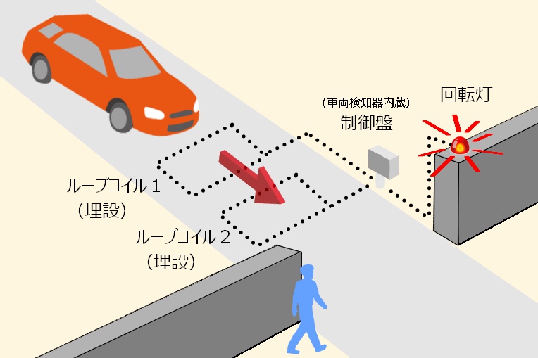 車両が矢印方向(ループコイル1→ループコイル2)に通過すると出口にある回転灯が点灯し、歩行者に車両が近づいていることを警告します。車両が逆方向(ループコイル2→ループコイル1)に通過した場合は、反応しません。